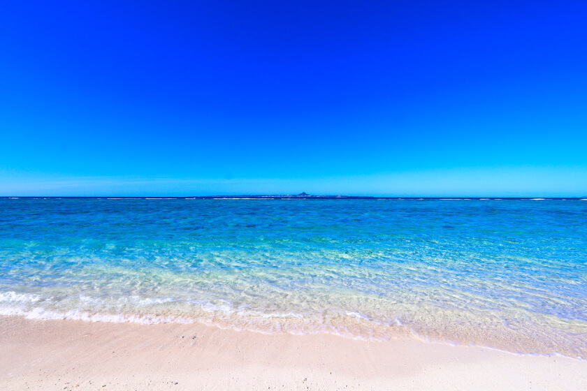 トップクラスの柔らかさを誇る白い砂浜が一面に広がり、沖合には水納島や伊江島やを望めます。